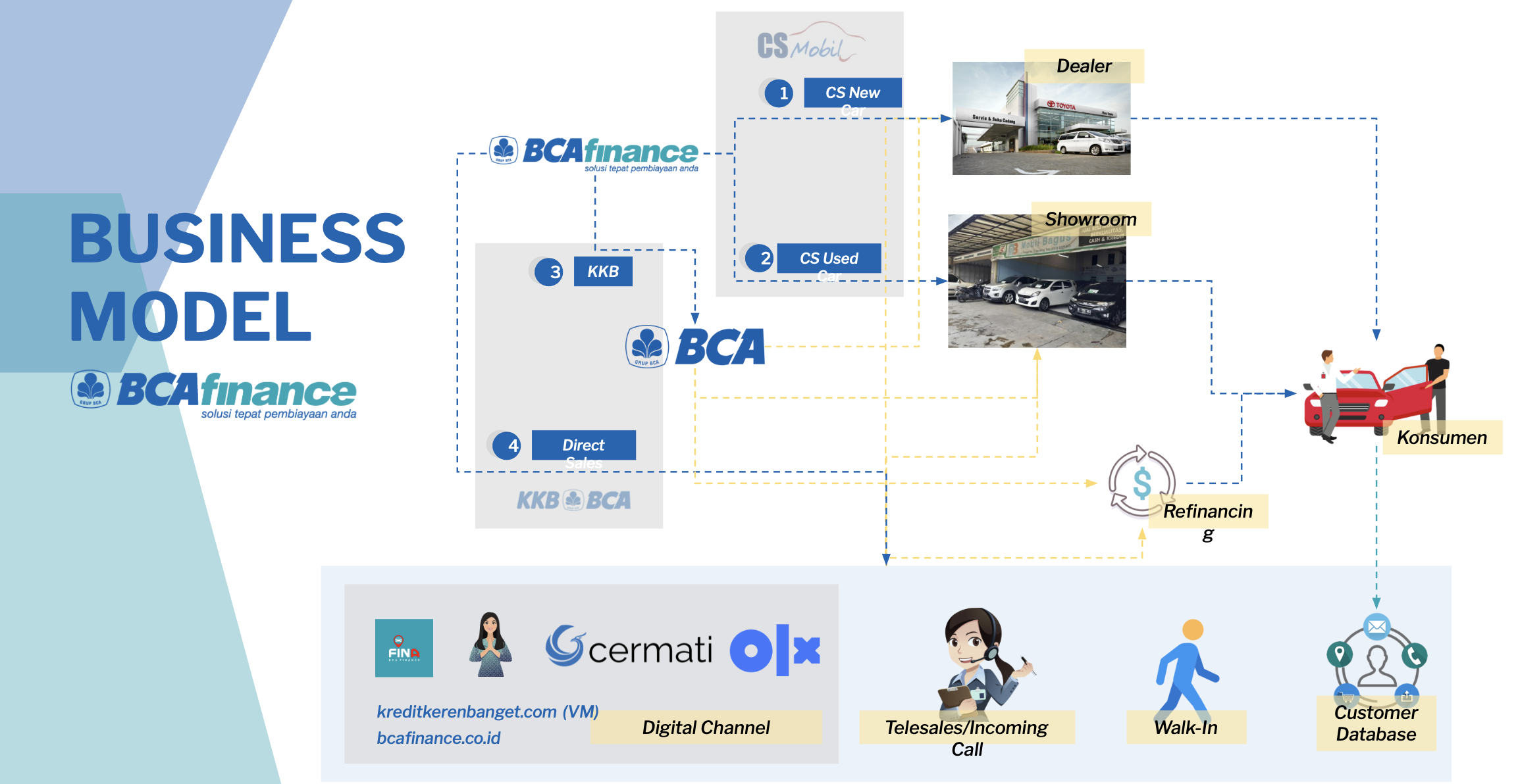 Alur KKB (Kredit Kendaraan Bermotor): Nasabah BCA datang ke Dealer atau Datang ke Bank BCA -> Pilih Unit -> BCA Kirim ke CMO, lalu CMO input ke ME -> lalu di cek oleh Doc Supp -> ke RM, DD, D1, D2 untuk approval -> jika disetujui, proses ke App untuk proses disbursement. Alur CS Finance (Central Sari Finance): Nasabah datang ke Dealer atau Showroom -> Pilih Unit & Input Order -> Survey/Analisa oleh checker -> Check Keabsahan dokumen oleh Doc Supp -> Credit Analyst -> Approval oleh RM, DD, D1, D2 -> Jika disetujui, proses ke App untuk proses disbursement. Alur KPM (Umum/Dealer Driven): Nasabah ke Dealer -> Pilih Unit & Input Order -> Survey/Analisa -> Approval & PO -> Unit Dikirim -> Bayar Cicilan. Alur KSM (Nasabah BCA/Customer Driven): Leads Database -> Penawaran Telesales -> Nasabah Setuju -> Bayar DP (VA) -> Order ke Dealer Rekanan -> Unit Dikirim -> Autodebet BCA.